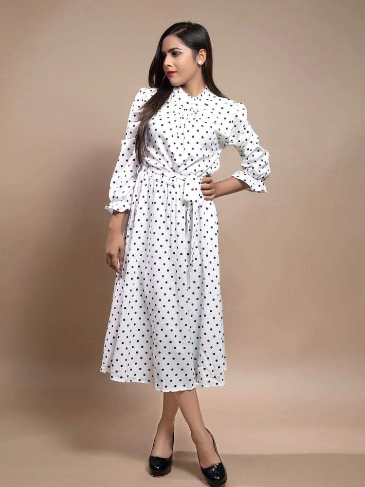 Discover timeless elegance with our exquisite polka dot A-line dress for women. This iconic silhouette effortlessly combines grace and versatility, flattering all body types with its gently fitted bodice that gradually flows into a classic A-shaped skirt.